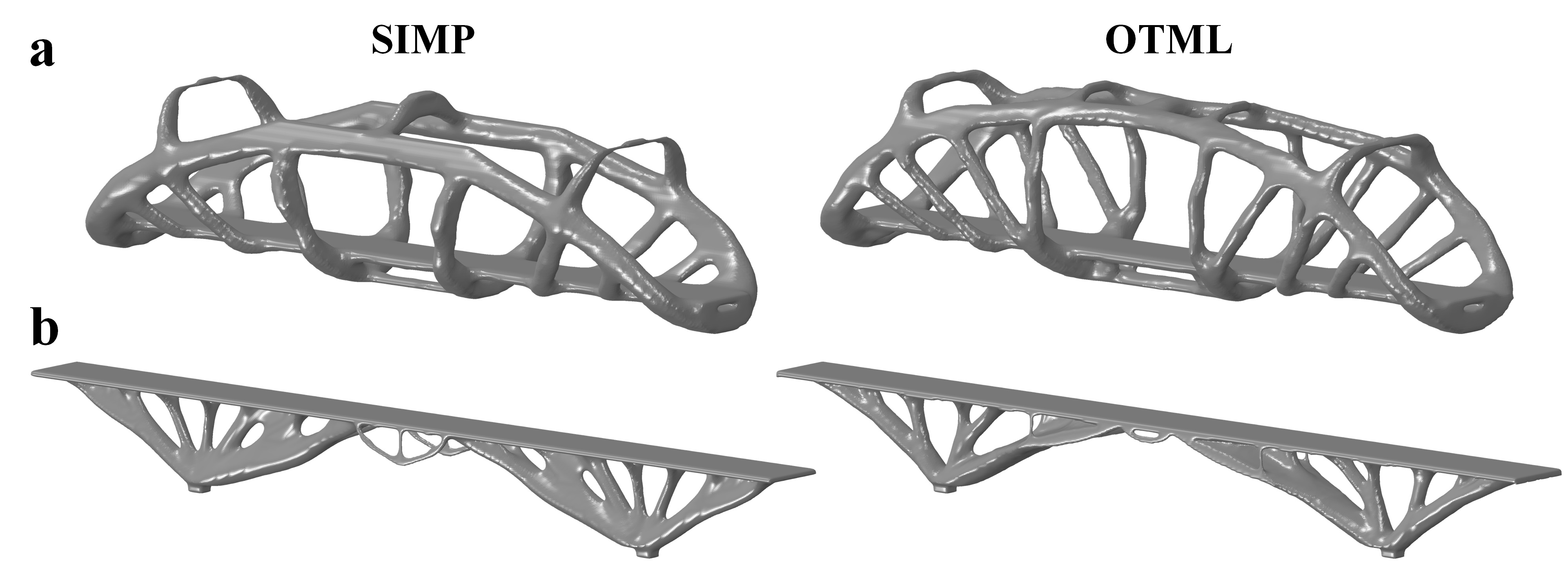 图5 结果对比。SIMP和OTML设计的(a)人行桥、(b)上承式拱桥。