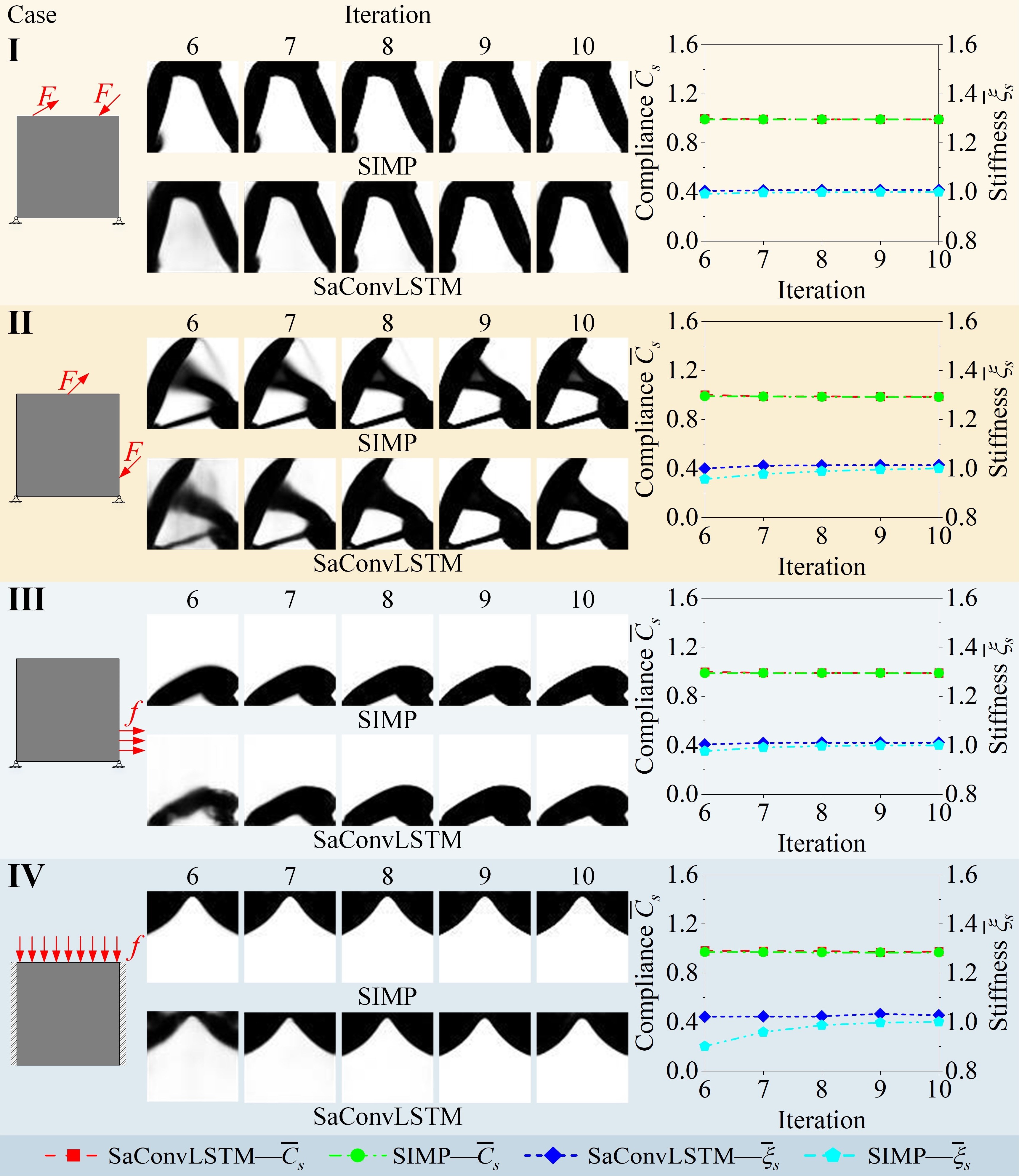 图3通过四个实例对比了SaConvLSTM模型和经典的SIMP技术。结果显示,两者对应的结构柔度的演化过程基本一致,而前者所生成的结构相较于后者性能略优。这表明,SaConvLSTM模型学会了设计变量的更新策略——即使载荷与边界条件不被包含在训练集内,仍然可以获得高质量的设计方案。
