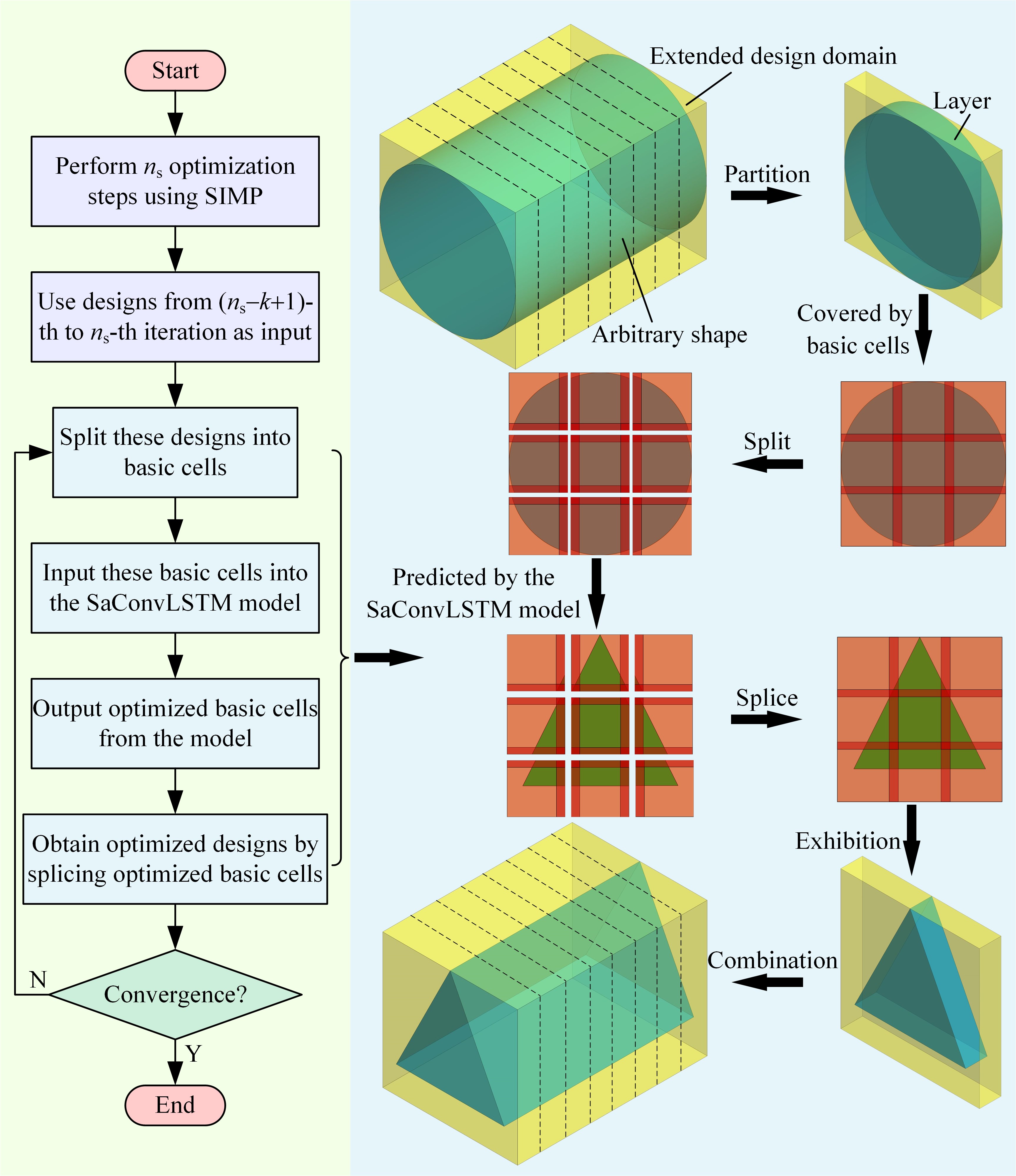 为此,赵子龙等提出了OTML方法。该方法旨在学习优化策略,而非优化结果。其核心架构包含三大要素:SaConvLSTM(融合了自注意力机制与卷积操作的长短时记忆神经网络)模型、扩展—拆分方法,以及拼接策略。如图1所示,SaConvLSTM模型中的自注意记忆模块保证模型的稳健性。利用传统优化技术生成训练集,用于训练SaConvLSTM模型。训练好的模型可以预测在任意载荷和边界条件下形状规则的基本单元的优化拓扑。扩展—拆分方法有效地丰富了SaConvLSTM模型的训练数据,赋予模型强大的泛化能力。拼接策略使得OTML方法能够处理任意形状的设计域。如图2所示,OTML方法先将设计域拆分为多个基本单元,然后利用SaConvLSTM模型预测基本单元的优化拓扑,并根据设计域的形状拼接出最终的结果。OTML方法只需完成一次模型训练,便能直接求解全新的优化问题,展现出良好的通用性与卓越的高效性。