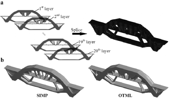 图4采用OTML方法完成了半通式拱桥设计。OTML设计的结构刚度比SIMP设计提高了2%。值得一提的是,OTML的计算耗时仅为SIMP的10%。