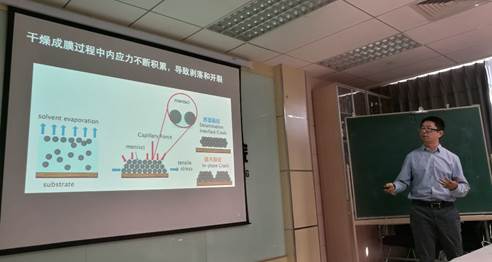 徐晔教授的报告介绍了他领导的课题组利用原位荧光显微成像和单颗粒追踪算法,形成新型的微观实验力学手段并应用于研究软物质体系中复杂的力学行为。他首先介绍了这个方法在胶体涂层干燥过程中出现的剥落和开裂问题研究中的应用。他们利用共聚焦三维成像和被称为拖延力显微镜(TractionForce Microscopy)的方法,直接测量了干燥成膜过程中胶体涂层的应力应变的空间分布和随时间的变化,特别是裂纹尖端附近应力应变场的演化。实验结果揭示了胶体涂层的开裂机理,以及液体在多孔颗粒网络中的流动对胶体涂层形变的影响。另外,徐教授还展示了该实验方法在其他力学问题,如具有复杂形貌的界面脱附、液滴三相接触线对柔性基底的形变,以及细胞与软组织的相互作用等研究中的应用,为更好地理解软物质体系的力学机理提供了重要的实验支持。与会师生针对该学术报告的创新型实验力学方法进行了热烈的讨论,并且对未来可能与我们固体力学所开展相关的合作进行了深入地探讨。